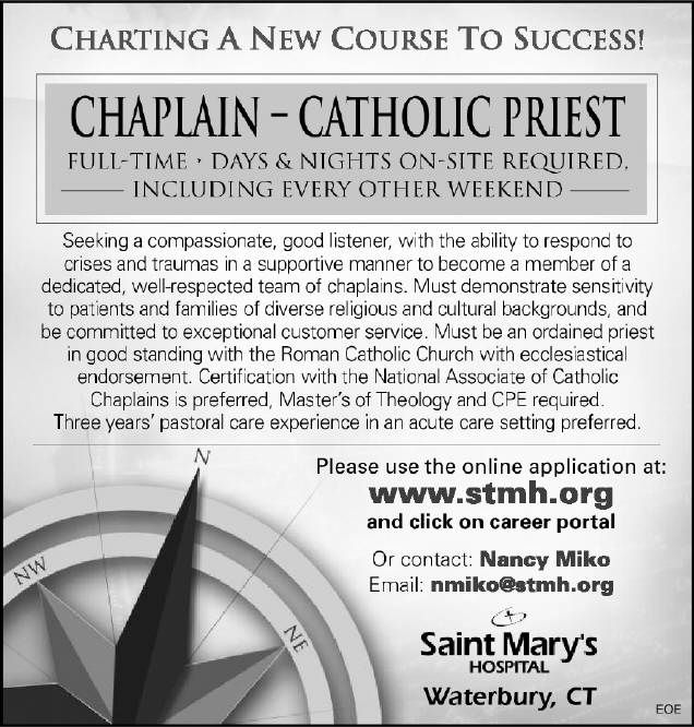 CHARTING A NEW COURSE TO SUCCESS!! CHAPLAIN CATHOLIC PRIEST FULL-TIME DAYS & NIGHTS ON-SITE REQUIRED,INCLUDING EVERY OTHER WEEKEND Seeking a compassionate, good listener, with the ability to respond to crises and traumas in a supportive manner to become a member of a dedicated, well-respected team of chaplains.Must demonstrate sensitivity to patients and families of diverse religious and cultural backgrounds, and be committed to exceptional customer service. Must be an ordained priest in good standing with the Roman Catholic Church with ecclesiastical endorsement. Certification with the National Associate of Catholic Chaplains is preferred, Master s of Theology and CPE required.Three years pastoral care experience in an acute care setting preferred. Please use the online application at:www.stmh.org and click on career portal Or contact:Nancy Miko Email:nmiko@stmh.org Saint Mary's Hospital. Waterbury, CT